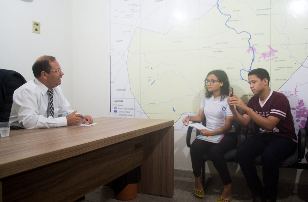 O presidente da Câmara Municipal de Atalaia, vereador Alexandre Tenório (PR), recebeu em seu gabinete na manhã desta terça-feira (24), os alunos Raquel e Luiz, do 9º ano do Ensino Fundamental da Escola Municipal Antônio Amâncio, localizada no bairro José Paulino, que acompanhados pela professora de Geografia Claudia Gerônimo, realizaram uma entrevista sobre a sua trajetória política, sobre a atual Legislatura, sobre a função do vereador e sobre a importância do Poder Legislativo como representante da comunidade atalaiense.