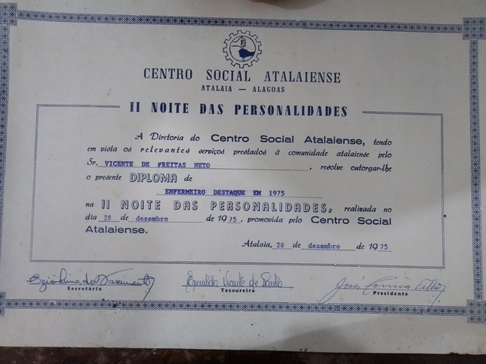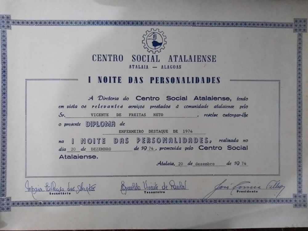 Durante duas edições da Noite das Personalidades (1974 e 1975), Vicente de Freitas Neto foi homenageado pela diretoria do Centro Social Atalaiense, como enfermeiro destaque, tendo em vista os relevantes serviços prestados à comunidade atalaiense.