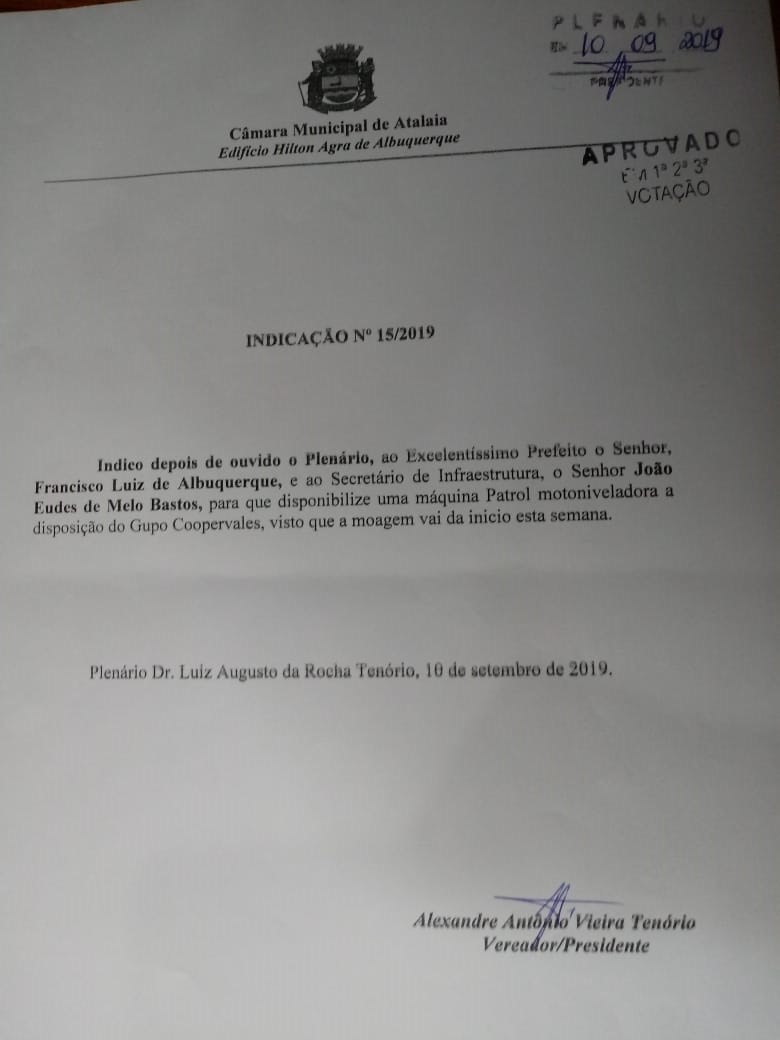 Enquanto aguarda o atendimento do Governo do Estado ao Requerimento apresentado, o presidente do Poder Legislativo de Atalaia também apresentou a Indicação 15/2019 solicitando da Prefeitura de Atalaia, através da Secretaria Municipal de Infraestrutura, que disponibilize uma máquina patrol motoniveladora, para que fique a disposição da Copervales, visto o inicio da moagem. A Indicação foi apresentada no mês de setembro próximo, como forma de solicitar que seja feito um trabalho paliativo na região.