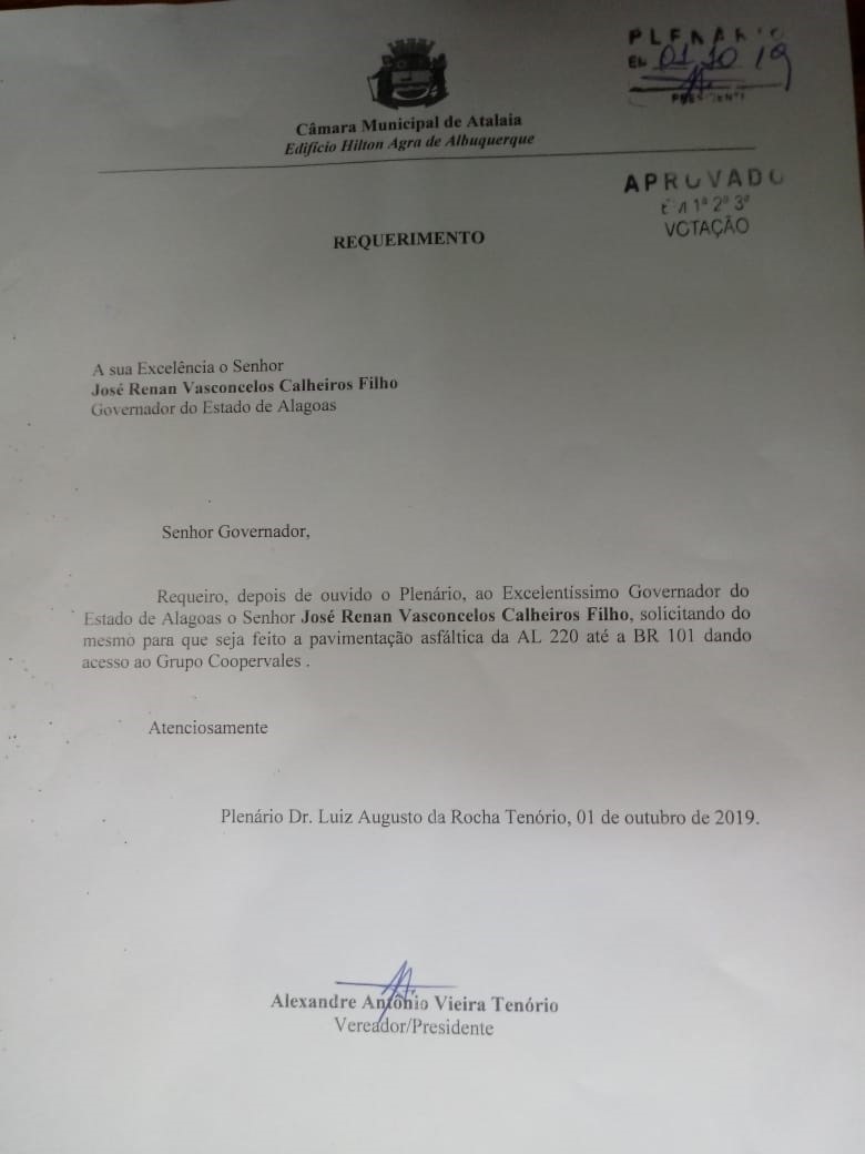 Na sessão ordinária desta última terça-feira (1), o presidente Câmara Municipal de Atalaia, vereador Alexandre Tenório, apresentou Requerimento direcionado ao Governador Renan Filho, solicitando do chefe do Executivo Estadual que seja feita a pavimentação asfáltica da AL 220 até a BR 101, beneficiando assim a estrada que dá acesso a Cooperativa dos Produtores Rurais do Vale de Satuba (Copervales), antiga Usina Uruba.