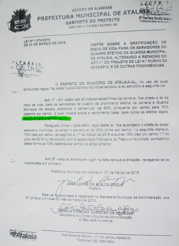 Na íntegra, o Artigo 1º da Lei 1.074/2016 diz o seguinte: Em razão das atividades específicas da carreira, fica criada a Lei de Risco de Vida, para os servidores de quadro de provimento efetivo de carreira da Guarda Municipal de Atalaia, alterando o percentual de 50% (cinquenta por cento) para 70% (setenta por cento), a qual incidirá sobre o vencimento base, para todos os efeitos legais, inclusive para a aposentadoria.