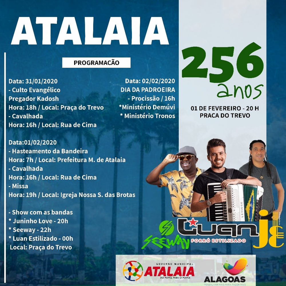 Contando com o apoio do Governo de Alagoas, a Prefeitura prepara uma programação especial para comemorar o aniversário de Atalaia. Os 256 anos serão festejados com eventos religiosos, culturais e shows gratuitos na Praça Duque de Caxias (Trevo) no dia 01 de fevereiro.