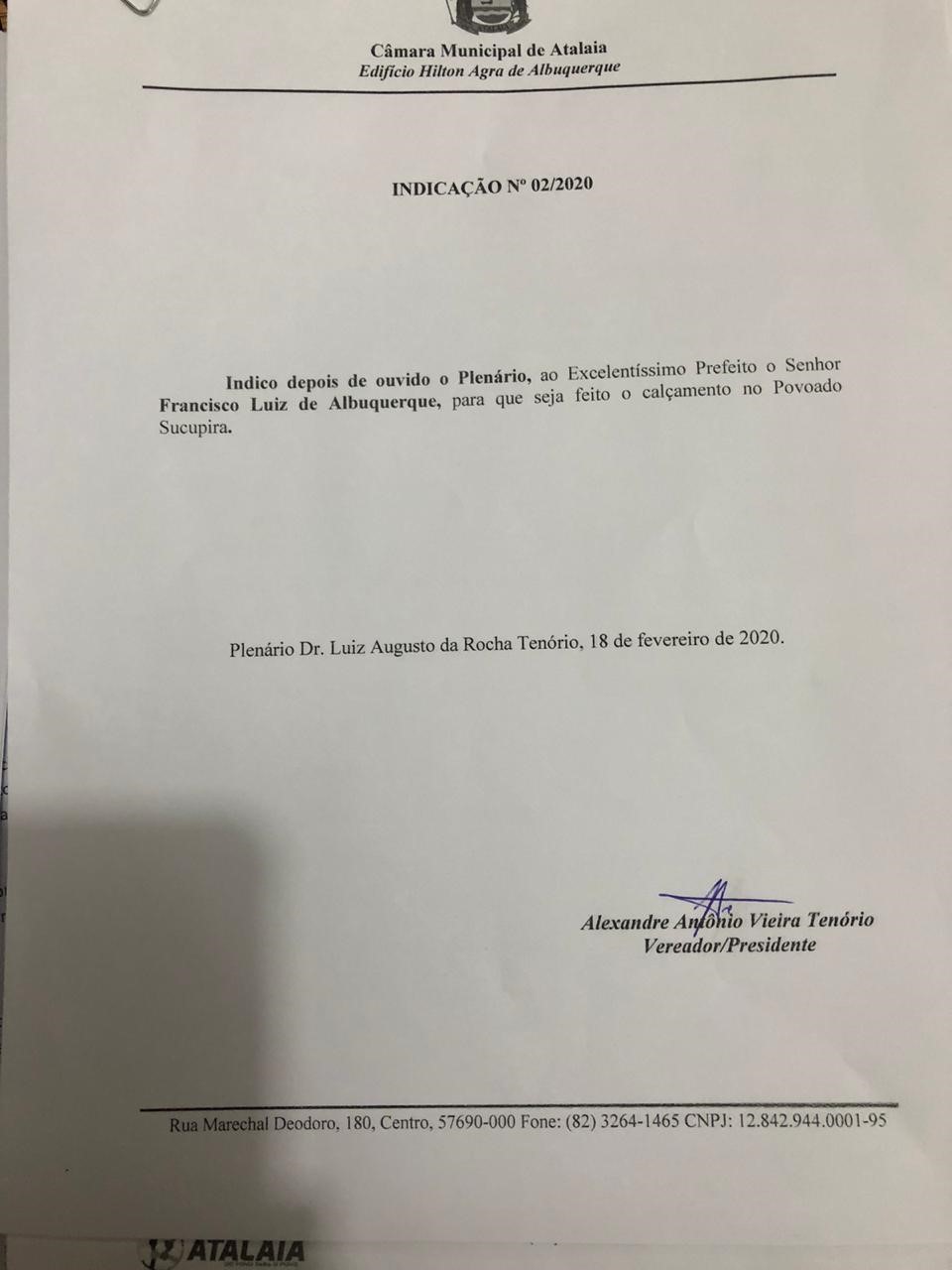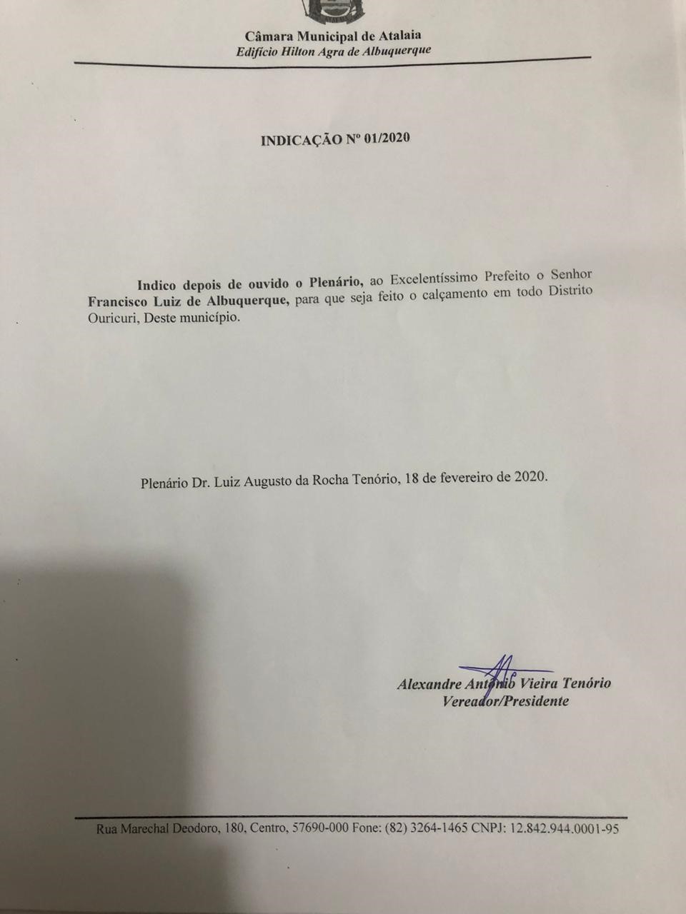 Durante a primeira sessão ordinária de 2020, realizada na manhã desta terça-feira (18), o presidente do Poder Legislativo de Atalaia, vereador Alexandre Tenório, apresentou as Indicações de números 01/2020 e 02/2020 para que ruas do Distrito Ouricuri e do Povoado Sucupira sejam contempladas com calçamento.